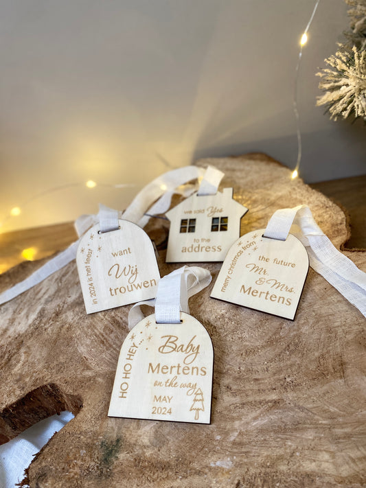 Maak deze kerst extra speciaal met een mooie aankondiging! Gaan jullie trouwen of verwachten jullie een kindje? Verras de volledige familie met jullie nieuws door een speciale kerstbal aan de boom te hangen!