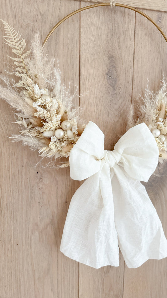 Kerstkrans met droogbloemen en lichtjes