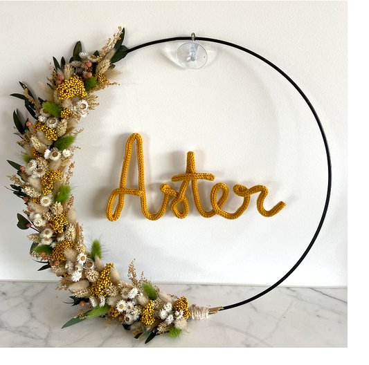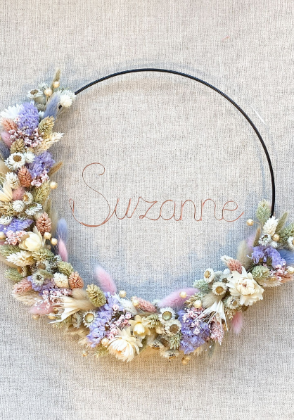 Droogbloemenkrans hangend met naam in ijzerdraad 25, 30 of 40 cm