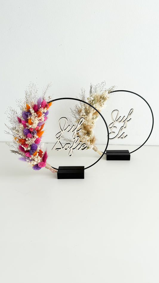 Couronne de fleurs séchées avec prénom en fil de fer 25, 30 ou 40cm