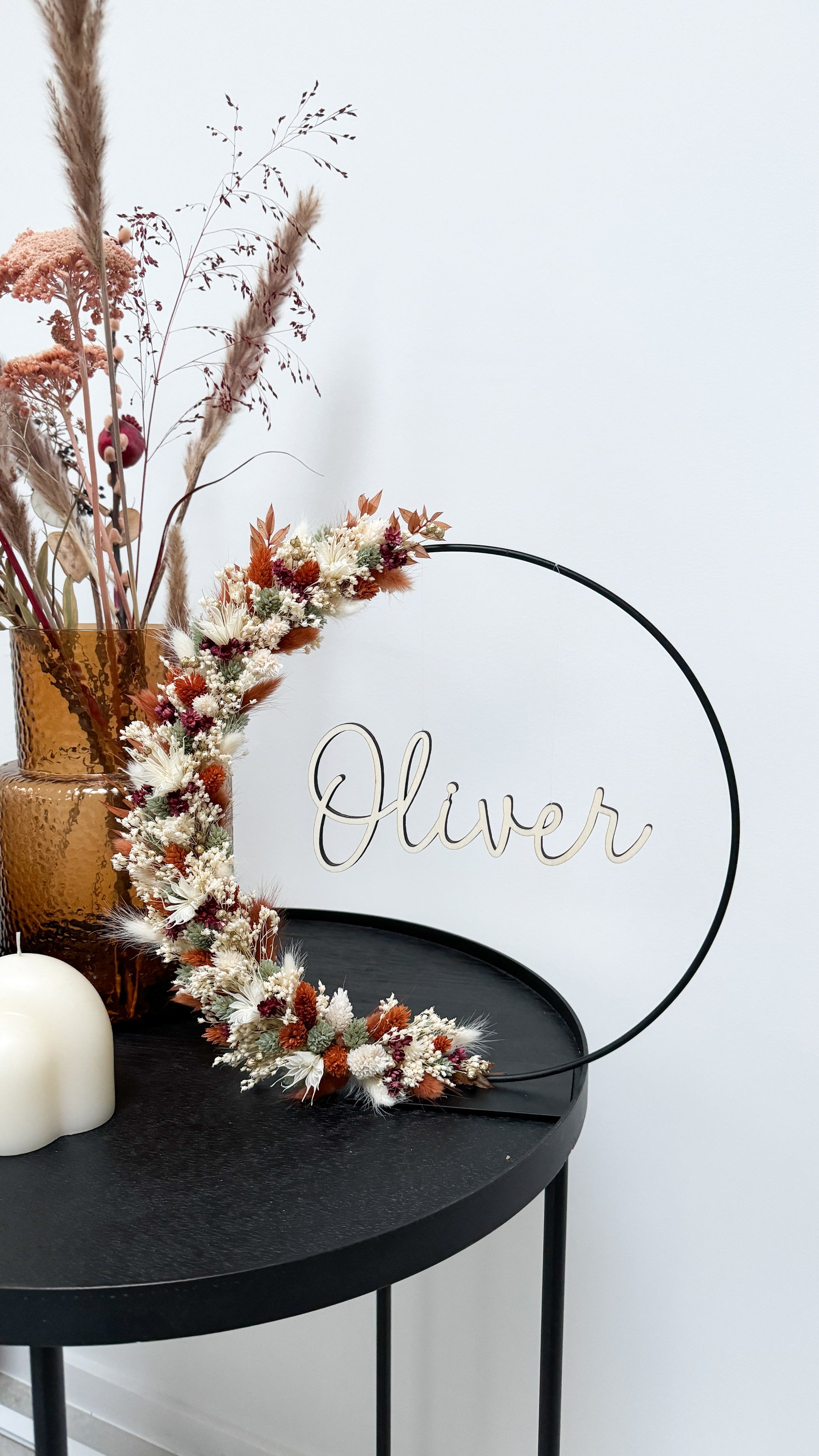 Couronne de fleurs séchées avec prénom en bois 25, 30 ou 40cm