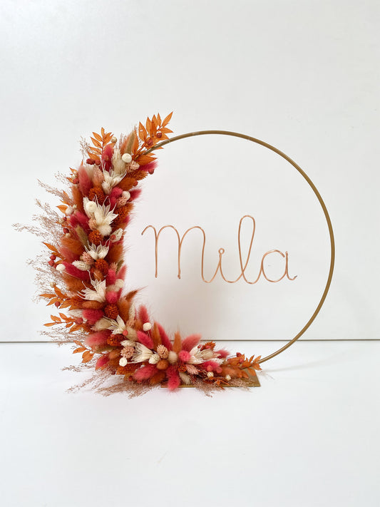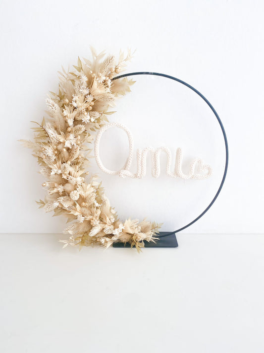 Couronne de fleurs séchées avec prénom en fil de fer 25, 30 ou 40cm