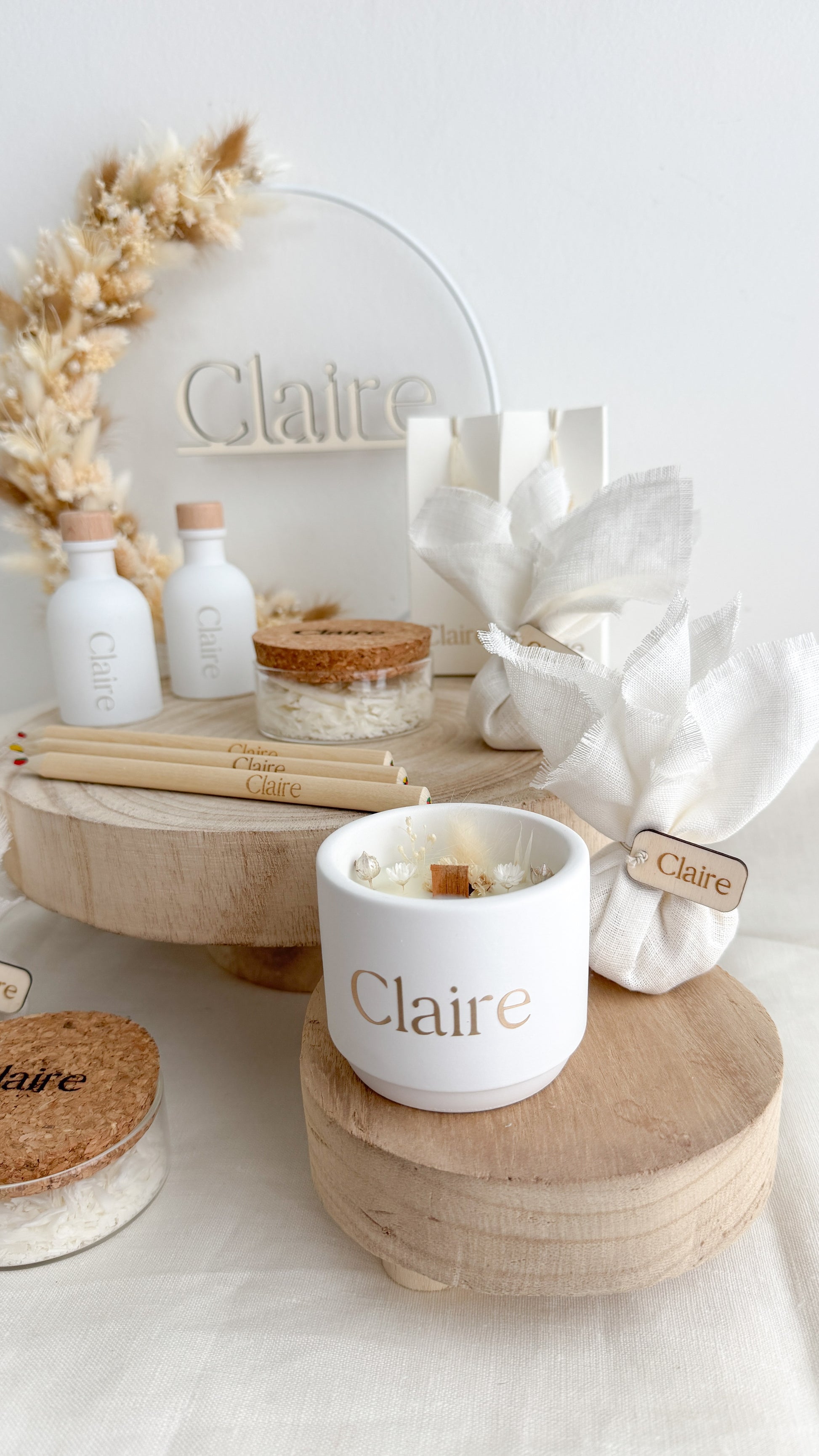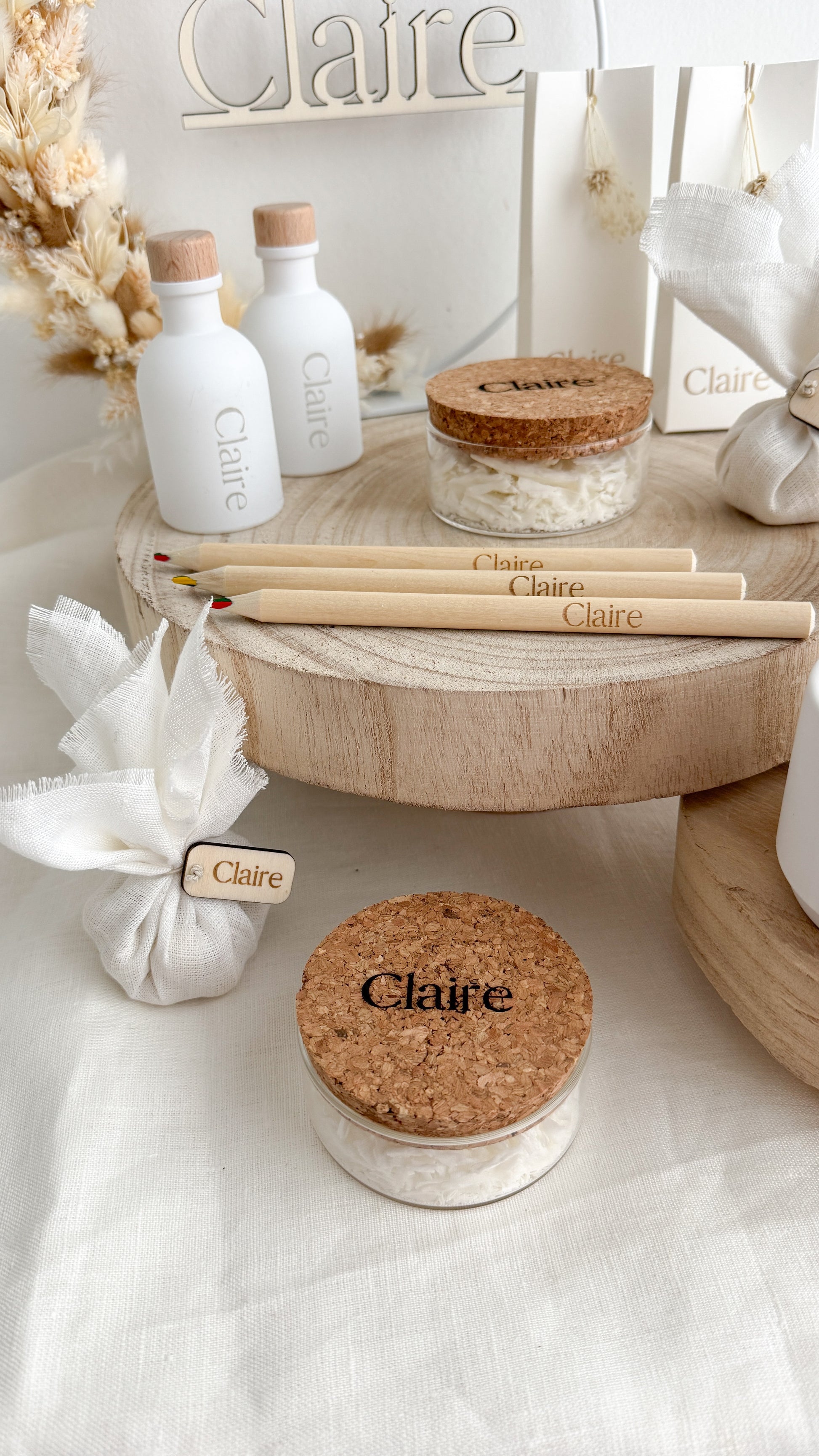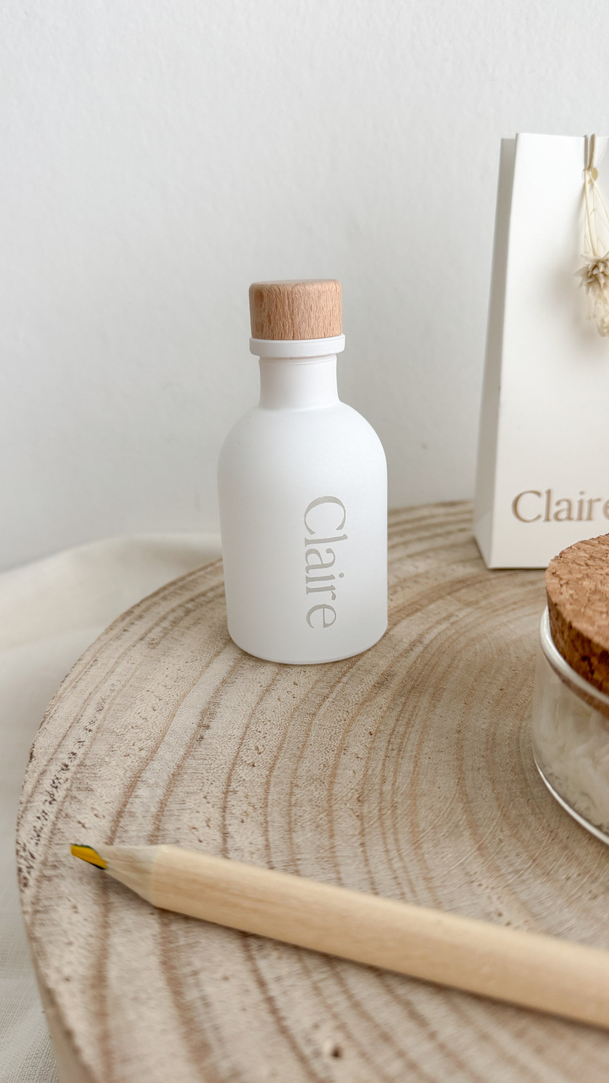 De naam van jouw kindje graveren we verticaal op de voorkant van het flesje. Graveren gebeurt door het bovenste laagje van het materiaal subtiel weg te branden, waardoor de naam zichtbaar wordt in een natuurlijke tint. Dit maakt elk flesje uniek en blijvend.
